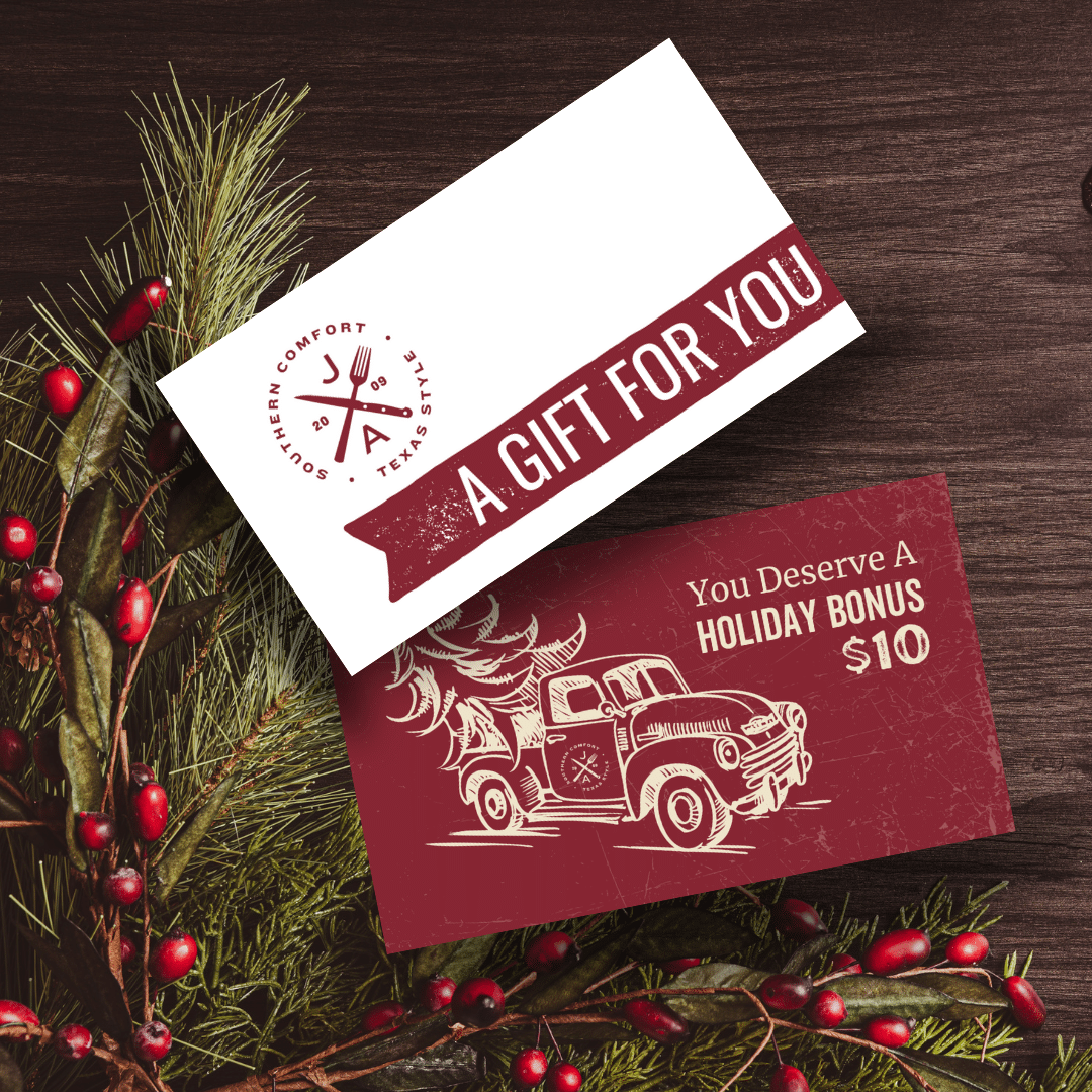From November 12 to December 24, 2025, receive a $10 Bonus Card for every $50 in Gift Cards purchased. Bonus Bucks are good from January 1 to February 9, 2026.